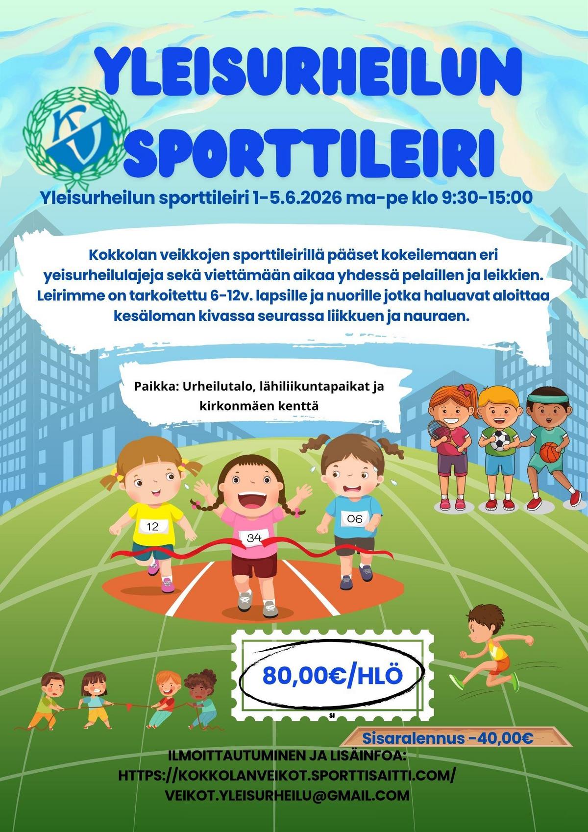 Tervetuloa mukaan liikkumaan, oppimaan ja pitämään hauskaa! Onko lapsesi täynnä energiaa? Tämä leiri on täydellinen tapa aloittaa kesäloma. Viikon aikana tutustumme monipuolisesti yleisurheilun eri lajeihin, pelaamme palloilupelejä ja leikimme yhdessä - unohtamatta hyvää joukkuehenkeä ja uusia kavereita.